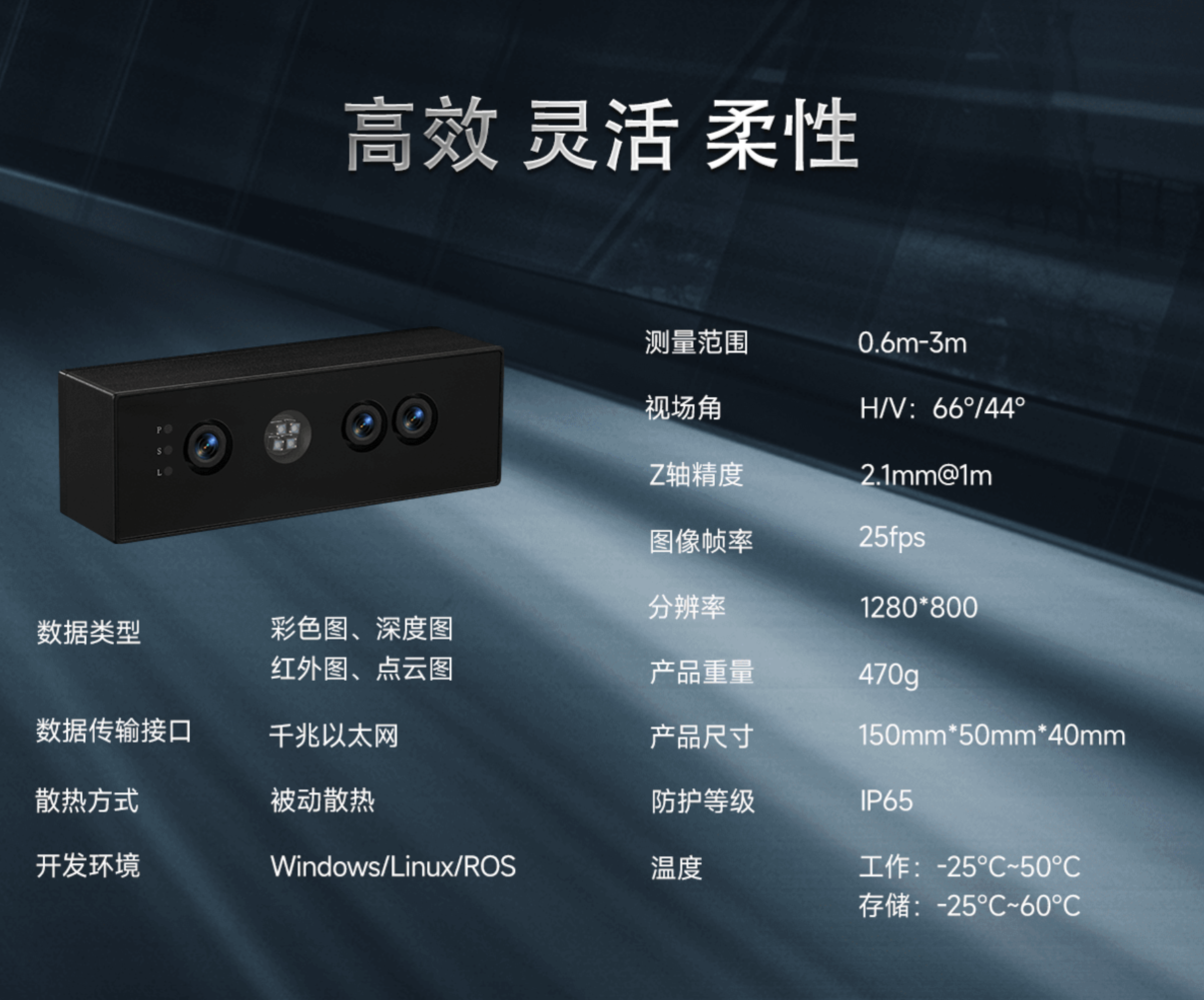 该产品结构尺寸为150mm x 50mm x 40mm,重量仅470g,小尺寸支持在静/动态体积测量、机械臂引导(eye-in-hand、eye-to-hand)、导航避障、叉车引导及机器人视觉引导等场景应用能发挥更独特的优势。