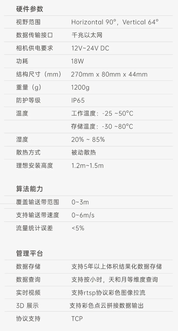 首页 动态 端到端 更易用丨必一·运动®散料运输动态监测与预警系统全新上市 端到端 更易用丨必一·运动®散料运输动态监测与预警系统全新上市 新品上市 2025-02-20 浏览量:164 在各类涉及散料运输的行业场景中,普遍面临着诸多棘手问题,严重影响生产效率、成本控制以及生产安全,作为具备端到端能力的 3D 视觉智能化解决方案专家,必一·运动机器人公司正式推出软硬件一体化智能散料运输动态监测与预警系统,护航全场景散料运输,助力多行业生产效率提升。 方案介绍 必一·运动®散料运输动态监测与预警系统 司眸® RGBD 智能相机 司眸®VAE020-800-X180是必一·运动机器人公司最新自主研发的升级款 工业级RGBD感算一体式智能相机产品,基于双目散斑结构光感知技术,异构3D实时成像技术提供更精细的深度感知,在SLAM、三维重建技术加持下,提升点云数据精度和图像处理能力,升级的增强光学投射系统,缩短曝光时长,减少运动模糊,更适用于高速场景。 智能料流检测软件 必一·运动公司智能料流检测软件,内置自研高精度料流测量算法,可全面监测输送带的运行速度、流量体积、堆料高度、块料大小、欠载状态、皮带跑偏等信息,实现输送带散货物流精细化监测。 监测管理平台 客户端软件支持实时视频查看、历史数据查询、实时人机交互控制。 系统功能 流量统计 司眸®VAE020-800-X180 RGBD 智能相机动态采集输送带上物料的三维数据,结合高精度流量体积测量算法,生成精准流量体积数据。 支持皮带速度:6m/s 数据查询:支持按小时、天和月等维度查询 自动测速 该方案能够自动测量输送带运动速度,确保及时发现异常,结合报警系统可防止设备故障或安全事故,同时实现料流精细化控制,优化输送调度,提升输送效率。 环境条件:需具备照明条件 覆盖输送带宽度:0 ~ 3m 块料检测 通过三维点云数据分析,能够识别自定义参数范围出现的块料,并突出标记,同时实时跟踪,并进行系统预警。 支持皮带速度:≤ 6m/s 块料参数自定义:支持 煤堆监测 实时监测料流高度,当发现料流高度过高可能导致物料堆积堵塞时,及时预警。 检测精度:毫米级 覆盖皮带宽度:0~3m 欠载检测 当检测到料流高度过低时,表明输送带此时处于欠载状态,系统可及时预警,消除生产安全隐患,提升生产效率。 检测精度:毫米级 覆盖输送带宽度:0~3m 跑偏检测 自主设定跑偏阈值,算法自动比较皮带实时偏移量和设定阈值,判断输送带是否偏离正常轨道,输出计算跑偏幅度和方向,显示具体数值,同时可及时发出警报。 检测精度:毫米级 覆盖输送带宽度:0~3m 核心优势 01 高精度测量,数据稳定输出 测量精度可达毫米级,测量结果与实际物料流量误差小于5%; 支持深度数据和RGB数据同步对齐输出; 02 超大景深,超宽视野 测量输送带宽度达3m; 测量堆料高度达1.5m; 03 部署简单,安装便捷 无需改变现场环境即可快速安装; 调试简单,系统易于维护; 04 端侧AI,架构简洁 数据传输延迟更低; 不需要额外工控机计算设备; 更省安装与维护成本; 05 一个平台,多个应用 单机实现散料皮带流量监控、堆煤、跑偏、测速等多种应用; 06 RGBD应用开发平台 司眸®RGBD智能相机可作为应用开发平台,持续衍生出更多闭环应用; 07 快速响应防爆需求 针对防爆需求,提供10mm厚度防爆玻璃解决方案,确保在防爆环境下正常使用而不影响3D成像效果; 方案能力 应用场景 Human+™必一·运动®深耕机器视觉领域近十年,3D 视觉 AI 技术积累深厚,经过长期自主研发,现已推出A系列、P系列,T系列、AT系列双目 3D 相机产品,基于自研 3D 相机,为客户和合作伙伴提供端到端的「3D 视觉+AI 」 自动化解决方案,打造软硬件一站式闭环服务体验。 我们一直秉持以服务客户为中心,将技术与产品创新作为对客户、行业和社会应尽的责任。未来,Human+™必一·运动®将坚持探索前沿科技创新,始终致力于各行业智能化转型升级,促进全社会生产效益提升。 上一个:小尺寸 更灵活丨必一·运动3D相机PEA020-800-Y80S上新,助力多场景智造升级 返回列表 下一个:没有了 更多新闻推荐 小尺寸 更灵活丨必一·运动3D相机PEA020-800-Y80S上新,助力多场景智造升级 新品上市 2024-09-29 目前主流3D视觉技术各有什么优劣势?如何选择最Match的工业3D相机? 技术科普 2024-08-12 【最全选型攻略】挑选合适的工业相机,必须提前考虑12要素! 工业相机 2024-07-16 场景应用丨必一·运动智能智能煤流监测系统全新升级,赋能自动化煤流管控 场景应用 2024-07-08 场景应用丨必一·运动智能3D视觉+AI深度学习,助超大型货物体积测量更准,更稳,更易用 场景应用 2024-06-04 超高读取 极致易用丨必一·运动智能发布RGBD动态包裹体积测量智能相机 新品发布 2024-04-26