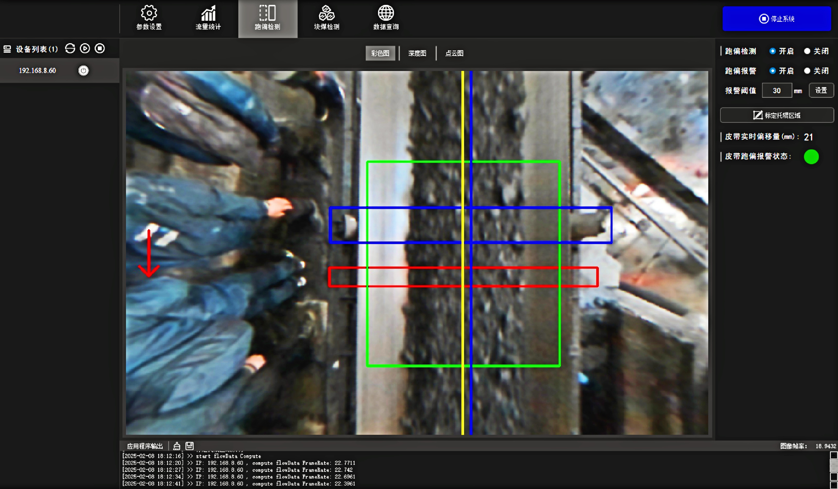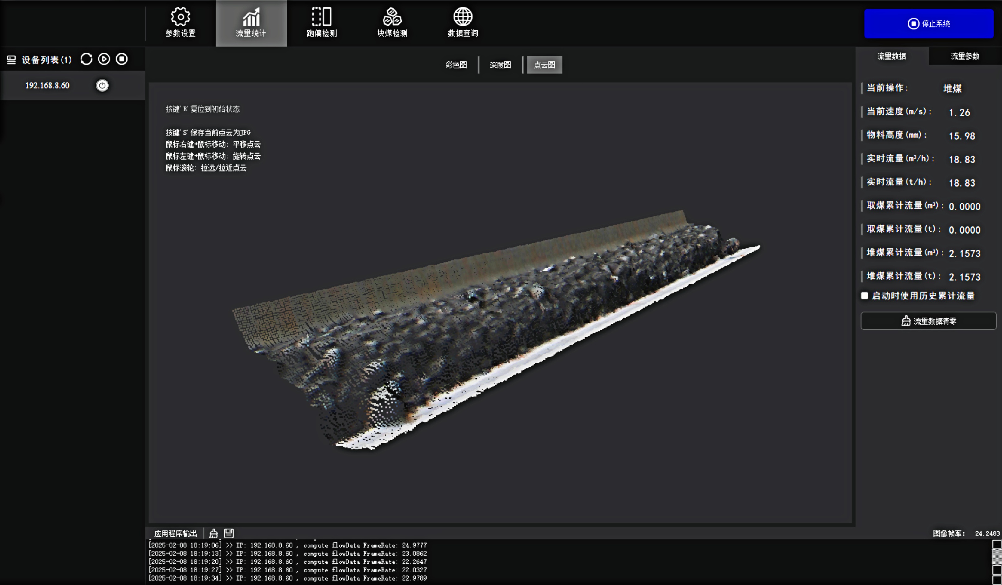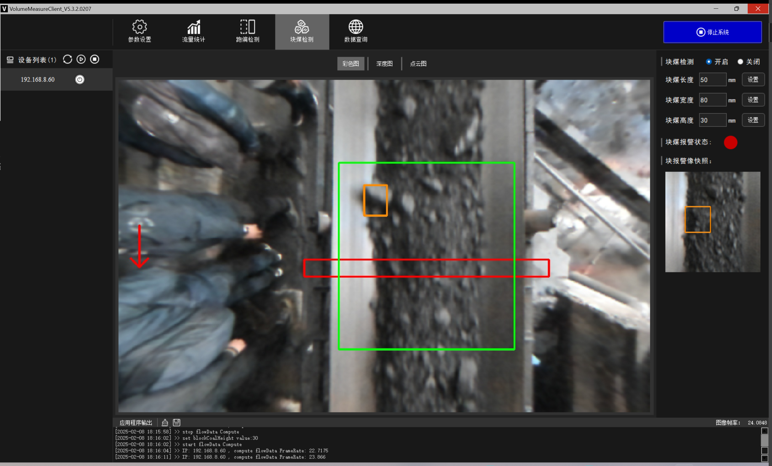 料型料流监测一体机系统 必一·运动®智能料型料流监测系统由智能煤流监测一体机搭配监测平台构成,实时监测输送带工业散料流量,包含煤矿、砂石骨料、粮食等 首页 产品 3D相机 必一·运动® 料型料流监测一体机 RBGD智能一体机 必一·运动® 料型料流监测一体机 系统由智能料流监测一体机搭载监测平台构成,由稳定的底层硬件、嵌入式算法软件和自动化监测管理平台实现服务,实时采集高精度煤流RGBD数据,完成场景的实时三维彩色点云重建,对高速运动的皮带输送机进行精细化管理调控→应用场景: 煤矿检测系统精细化管理 定制解决方案 应用场景 煤流统计支持皮带速度6m/s,环境适应强,部署简单,无需改造现场环境即可安装块煤检测通过三维点云数据分析,能够对块煤的尺寸进行精确测量,准确计算出块煤的长、宽、高等尺寸数据输送带自动测速自动测量高速运动中的输送带速度,确保及时发现异常波动输送带跑偏检测通过获取的输送带三维尺寸位移信息,对皮带左右边缘位置与阈值比较并判断是否偏离正常轨道,同时计算跑偏幅度和方向煤流高度检测对煤流高度精准检测,能够有效管理煤流的分布、运输量、堆积情况 产品特点 测量误差<5%在高速动态检测上,测量精度可达毫米级,测量结果与实际煤量误差小于5%工业级硬件设计采用IP65防护等级和工业级防尘防水,可在高粉尘、大温差的情况下稳定运行室内暗光环境适用在室内、地下、夜晚能稳定测量,无需补光部署简单,安装便捷,支持二次开发出厂相机内参标定,可快速部署集成,无需改变现场环境即可安装,实施速度快,调试简单,系统易于维护接口丰富,数据直传丰富的系统对接接口,可直接对接PLC、变频器、服务器,快速完成精细化皮带控制大景深、大视野,多范围应用测量皮带宽度达2.4m;煤堆高度达1.5m边缘计算架构,实时测量使用边缘计算架构,将多种智能算法在边缘端实现,保证数据实时传输 性能参数 RGBD智能一体机型号VEA020-800-X180参数技术原理主动式双目基线长度180mm测量范围0.9m~2.5mZ向精度1m:≤1.3mm帧率25fps数据类型深度图、彩色图、红外图、点云图分辨率彩色图像:1280x800/640x400 ; 深度图像:1280x800/640x400像素形式彩色图: 8位三通道图 ;深度图:16位单通道图彩色视场角Horizontal 90°,Vertical 64°深色视场角Horizontal 90°,Vertical 64°RGBD同步对齐支持曝光类型全局曝光曝光控制自动/手动流量统计技术参数推荐安装高度1.2m~1.5m覆盖输送带范围0~3m支持输送带速度0~6m/s,推荐0~4m/s流量统计精度误差<5%物料高度测量支持,精度毫米级自动测速支持,安装位置需要具备照明条件实时流量统计 支持,统计周期支持配置跑偏检测支持,跑偏精度可达毫米级块煤检测 支持,支持块煤参数定义数据存储支持5年以上体积结果化数据存储数据查询支持按小时,天和月等维度查询实时视频支持rtsp协议彩色图像拉流点云数据支持彩色点云拼接数据输出协议支持TCP硬件参数数据传输接口千兆以太网相机供电要求12V~24V DC功耗18w结构尺寸(mm)270mm x 80mm x 44mm重量(g)1200g防护等级IP65温度工作温度:-25 ~50°C ;存储温度:-30 ~80°C湿度20% ~ 85%散热方式被动散热软件支持开发环境Windows/Linux数据协议TCP数据查看流量统计客户端 点云图 资料下载 必一·运动® 煤流体积测量输送带监测管理平台 产品资料下载 请填写此表格并点击提交后,程序会自动下载文件 *合作意向 请选择 商务合作 媒体合作 投资者合作 *电话 *姓名 公司 行业 职位 邮箱 地址 您的留言 提交并下载资料 您也可以拨打我们的客服电话:www@biyi.com 联系我们